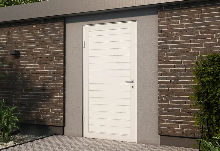 Создайте гармоничный тандем в экстерьере гаража. Для этого достаточно заказать боковую дверь в едином стиле с секционными воротами.
